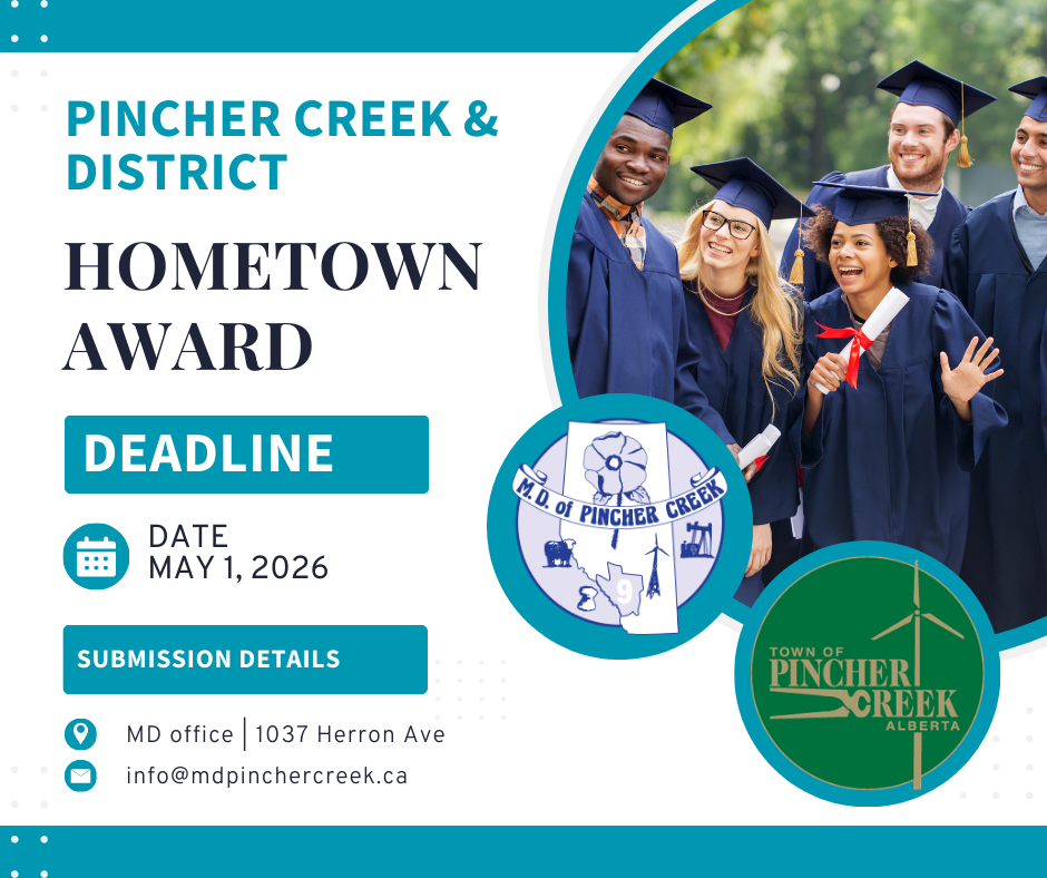 Grade 12 students attending Matthew Halton High School, St. Michael’s School, and Livingstone School who reside within the MD boundaries are invited to apply for the Pincher Creek & District Hometown Award. This includes residents of Cowley, the Municipal District and the Town of Pincher Creek. Administered by the MD, this award is a testament to our community's commitment to “giving back.”